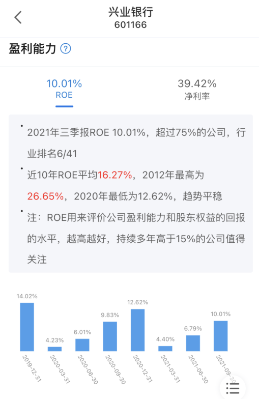而兴业银行的盈利能力也可以从净资产收益率来判断。根据公司去年第三季度报告显示,当期的净资产收益达到了10.01%,在同行业当中排名居前,而且从公司历年的净资产收益率柱状图我们也可以较为直观地看到目前公司的净资产收益率正处于上涨区间,也就意味着未来公司的ROE水平可能进一步提升,从而给股东带来更多的收益。