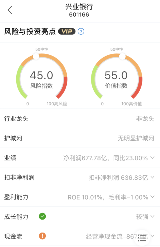 虽然从长期来看,银行板块已经调整了较长的一段时间了,不过兴业银行的股价表现倒是还可以,可能也正是基于此,摸象APP给出兴业银行45的风险指数。同时又给出了兴业银行55的价值指数,这可能与银行行业去年整体良好的表现有关。根据3月22日银保监会发布的数据显示,2021年末银行业金融机构科技型企业贷款余额较年初增长23.2%,高于贷款平均增速12.1个百分点,这些如果不出现呆坏账的话,对于银行来说,都算是未来的预期收益。