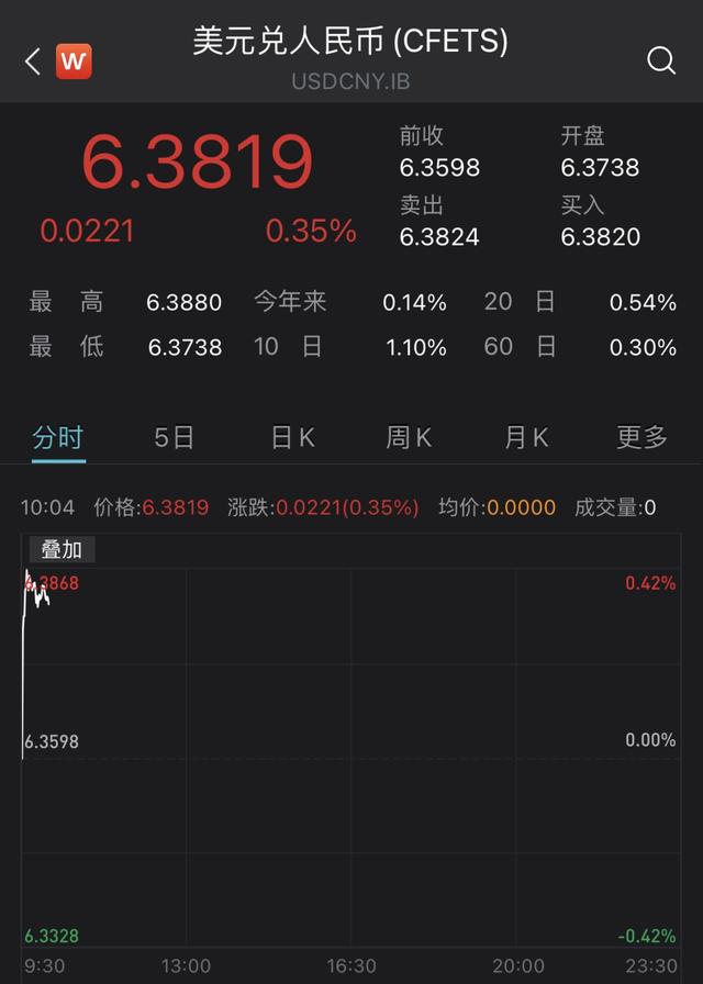 在中间价出炉后,人民币对美元即期汇率开盘即跌破6.37关口,在以6.3738开盘后,随即跌破6.38关口,截至发稿最低贬值至6.3880,较前一交易日的日间收盘价下跌282个基点。随后,人民币对美元即期汇率跌幅有所收窄。