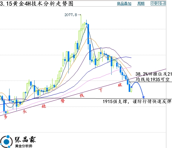 金价周一跌破始于2月初的上升支撑线,周二延续跌势,并跌向21日均线和2021年9月-2022年3月升势的38.2%斐波那契回撤位,上述水平在1935附近。从日线图来看,上月初以来最看空的MACD信号,以及向下倾斜的相对强弱指数(RSI),也为看跌倾向提供支撑。亚盘金价跌破关键水平1935,后市恐进一步大跌。若失守1900,那么1877附近的2021年11月高点,可能会在之后对空头构成挑战。至于4小时线,MACD金叉开口持续扩大,均线下破平衡线,绿色量能柱放量,空头趋势加强,同时布林带开口打开,且向下拐头,价格处于下轨平滑运行,行情回调需求不大。那么在美联储加息靴子落地之前,张晶霖建议继续顺势反弹做空黄金即可。