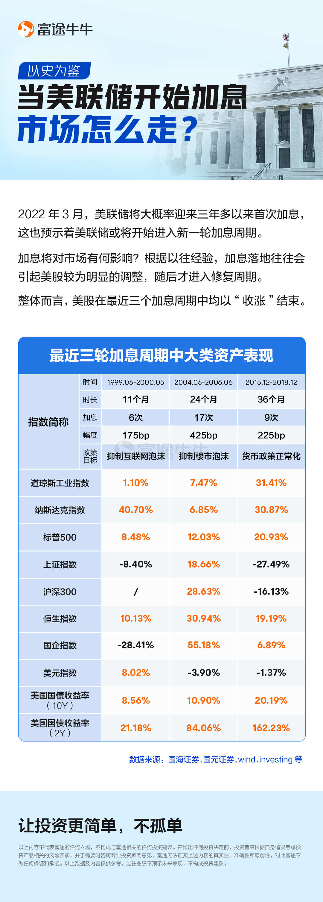 从全周期看,美联储前三次加息周期内,美股及港股出现了不同程度的上涨,表明加息在短期内冲击股市,但难改资产长期向上趋势。