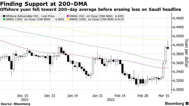 离岸人民币跌向200日平均水平之后收复跌势/图源:彭博社