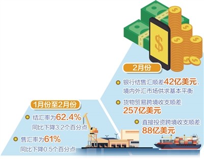 数据显示,贸易投资等实体经济相关跨境资金延续净流入。2月份,货物贸易跨境收支顺差257亿美元,同比增长41%;直接投资跨境收支顺差88亿美元,其中外商来华直接投资资本金净流入保持较高规模,同比稳步增长。对于上述贸易投资活动带来的外汇流入,境内主体一部分结汇,另一部分以外币存款形式持有。1月份至2月份,结汇率(客户向银行卖出外汇与客户涉外外汇收入之比)为62.4%,同比下降3.2个百分点;售汇率(客户从银行买汇与客户涉外外汇支出之比)为61%,同比下降0.5个百分点。