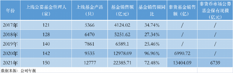 年报显示,2021年,天天基金上线150家公募基金管理人1.278万只基金产品,基金销售额为2.239万亿元,同比增长72.48%。继2020年,销售额破1万亿元后,天天基金再次实现高增长。