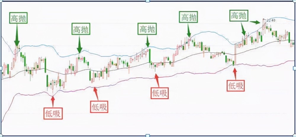 具体使用方法跟方法一类似:在布林线的上轨附近做高抛,在布林线的下轨附近做低吸。