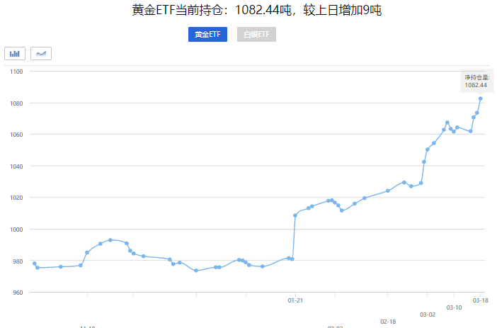 【黄金ETF持仓】截止到3月18日,较前一日增加9吨,当前持仓为1082.44吨。