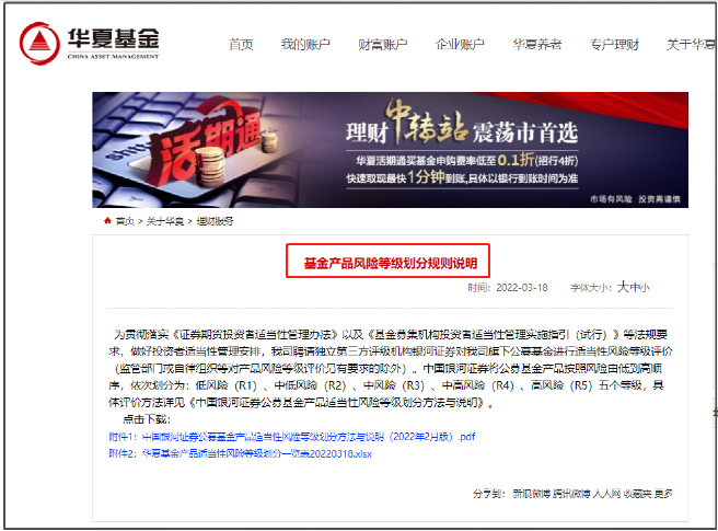 而在3月18日,华夏基金就发布公告,为贯彻落实《证券期货投资者适当性管理办法》以及《基金募集机构投资者适当性管理实施指引(试行)》等法规要求,做好投资者适当性管理安排,华夏基金聘请独立第三方评级机构银河证券,对公司旗下公募基金进行适当性风险等级评价,并对基金评价的具体方法进行了说明。