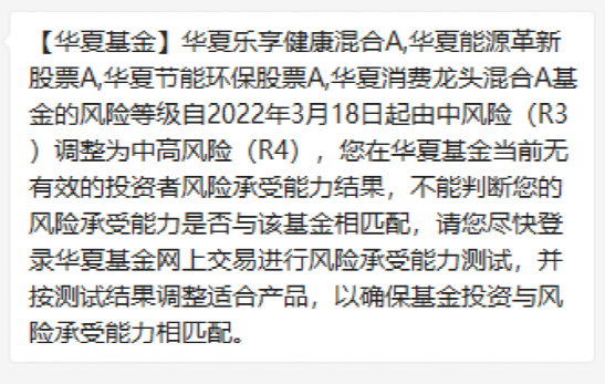 近日,多位投资者收到一条短信提示,“【华夏基金】华夏乐享健康混合A,华夏能源革新股票A,华夏节能环保股票A,华夏消费龙头混合A基金的风险等级自2022年3月18日起由中风险(R3)调整为中高风险(R4),您在华夏基金当前无有效的投资者风险承受能力结果,不能判断您的风险承受能力是否与该基金相匹配,请您尽快登录华夏基金网上交易进行风险承受能力测试,并按测试结果调整适合产品,以确保基金投资与风险承受能力相匹配。”