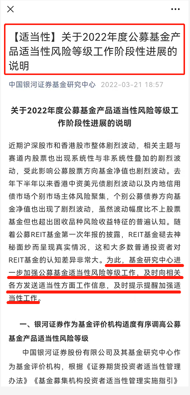 事实上,随着2021年以来基础市场的大幅震荡,银河证券基金研究中心就陆续针对公募REIT基金、QDII债券基金等开展了投资者适当性风险等级的调整。