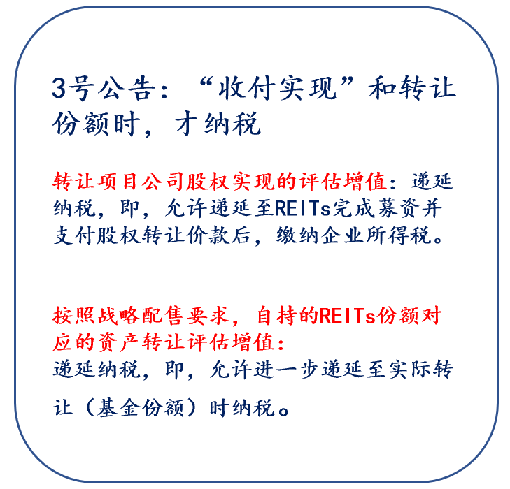 综上,以上这两次递延(延到实际支付价款时,延到战略份额转让时)充分体现了3号公告考虑了REITs实操中非常重要的纳税资金问题,对原始权益人的支持可谓相当之有诚意。