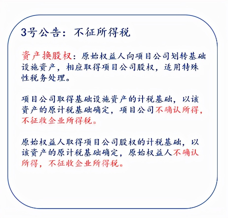 而3号公告规定,对于公募REITs, 设立基础设施REITs前,原始权益人向项目公司划转基础设施资产相应取得项目公司股权,适用特殊性税务处理,原始权益人和项目公司均不确认所得,不征收企业所得税。项目公司取得基础设施资产的计税基础,以基础设施资产的原计税基础确定;原始权益人取得项目公司股权的计税基础,也以基础设施资产的原计税基础确定。可以说,3号公告破除了特殊性税务重组的严苛要求,对公募REITs大开免税之门。