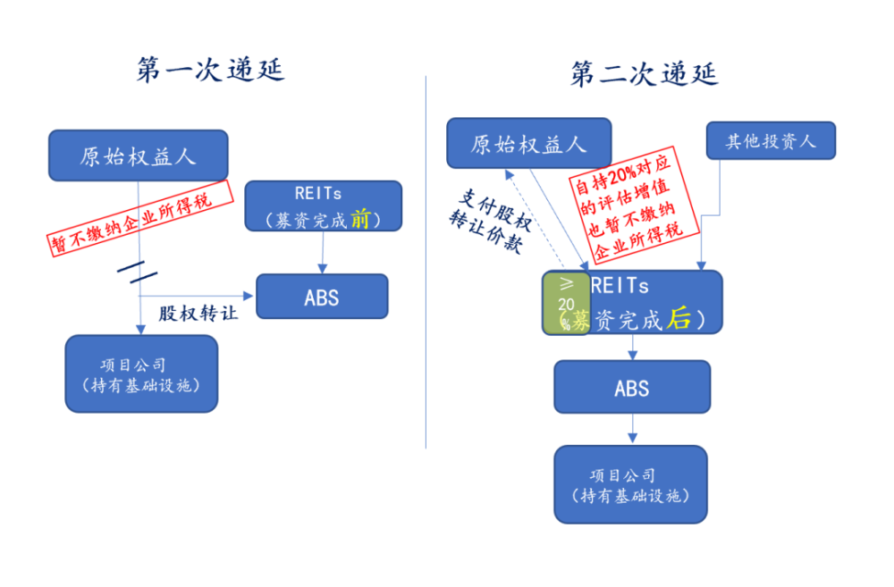针对此,3号公告对于公募REITs继续体现了其支持的诚意——允许继续递延交税。3号公告规定“基础设施REITs设立阶段,原始权益人向基础设施REITs转让项目公司股权实现的资产转让评估增值,当期可暂不缴纳企业所得税,允许递延至基础设施REITs完成募资并支付股权转让价款后缴纳。其中,对原始权益人按照战略配售要求自持的基础设施REITs份额对应的资产转让评估增值,允许递延至实际转让时缴纳企业所得税。”