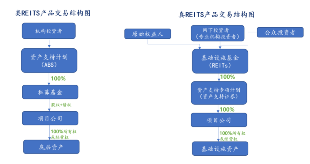 早在2008年,国务院常务会议,研究讨论九项金融措施,其中就有一条提出要发展不动产投资信托基金。在此后到2020年前的十几年间,我国市场上的不动产资产证券化主要是“类REITs”产品,类REITs之所以被称为类REITs, 因为类REITs实现了不动产证券化,以底层不动产资产产生的营收现金流(租金/特许经营收费等)为REITs投资人的收益来源,这种证券化方式和真REITs相似。但不同点在于,类REITs产品,收益来源主要以构建私募基金对项目公司(持有底层资产)的债权收益为主,原始权益人以其自身信用参与交易并提供对投资人的偿付保障(一系列偿付措施包括:回购资产、回租资产、差额补足增信等),机构投资人获取的是原始权益人(所控制的项目公司)支付的债权性投资的利息收益,所以类REITs产品收益凸显的更多是债权性收益。而真REITs主要构建ABS对项目公司(持有底层资产)的真股权,投资人获取的是项目公司经营分红收益和资产价值提升带来的基金份额价值增值收益,所以真REITs凸显的是真股权性收益。这是类REITs和真REITs最大的区别。