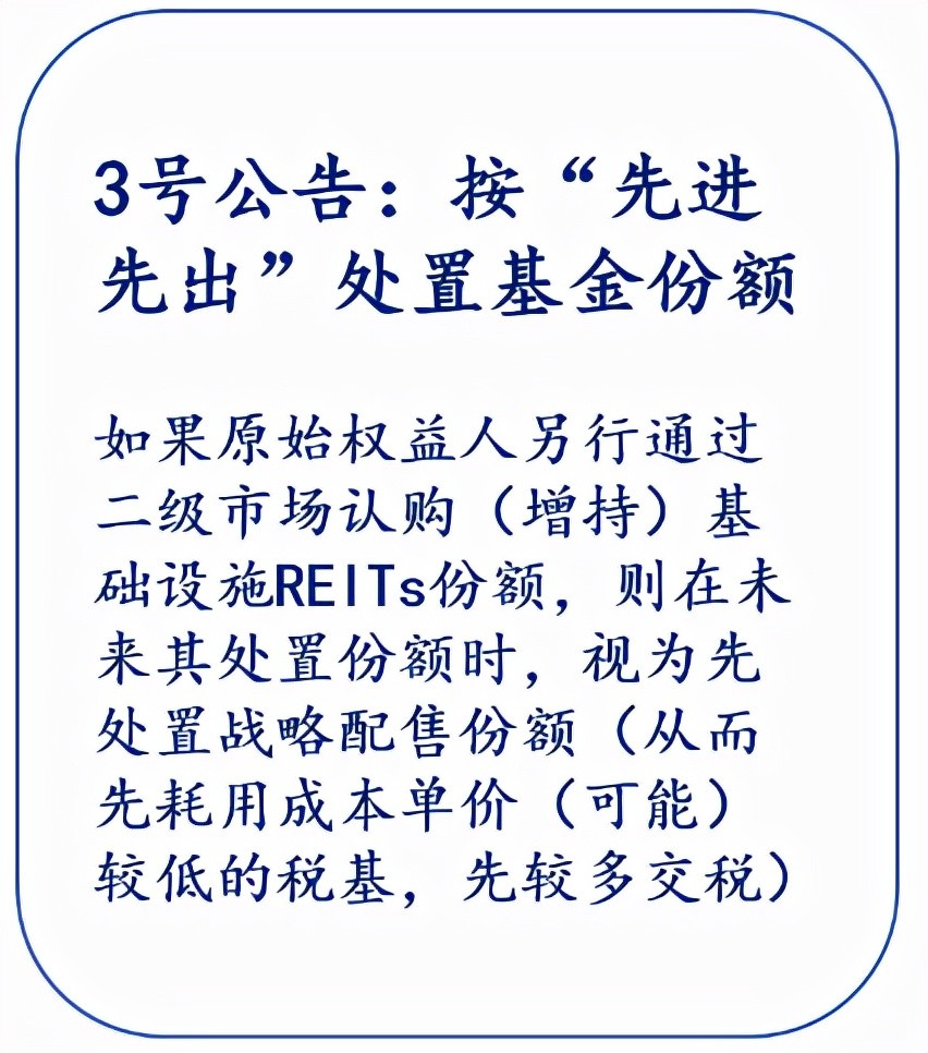 REITs上市交易后,如果原始权益人再从二级市场增持REITs份额,3号公告规定,处置所持有的基金份额时,按照先买入(也就是战略配售的份额)份额先处置,后买入份额(二级市场购入的流通份额)后处置的原则,计算应交税款。实务中,战略配售的份额往往成本(计税基础)低,后买入的流通份额往往成本(计税基础)高。而原始权益人卖出份额时,不一定处置的是战略配售份额,因为此时战略份额可能还在锁定期内,但3号公告要求,卖出时,视为先处置战略份额,这样的税务效果是视为原始权益人先较多获利,较多交税。直到处置完所有的战略份额,后面的流通份额处置才能以市场购入的成本计算。总的来说,处置阶段的税负曲线是先高后低,但本质上也只是前期多交税,后期少交税的时间性差异。