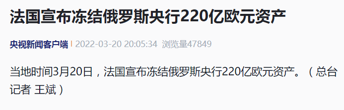 当地时间3月20日,法国经济和财政部长勒梅尔表示,法国已经冻结了俄罗斯中央银行220亿欧元的资产,还冻结了俄罗斯有关个人在法国机构账户中的资金约1500亿欧元。另有约30名俄罗斯人在法国的价值5亿欧元的房地产也被冻结。