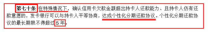 这两年受天灾人祸影响,导致信用卡大面积逾期,国家也出台了相关法规扶持信用卡逾期用户,《商业银行信用卡业务监督管理办法》第70条规定:逾期持卡人仍有还款意愿的,可以和银行平等协商,达成个性化分期还款协议,分期期数最长为5年也就是60个月,从而大大减轻持卡人的还款压力!