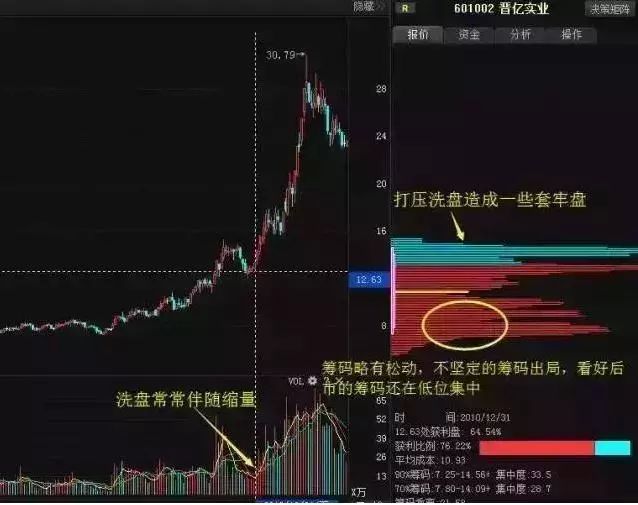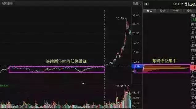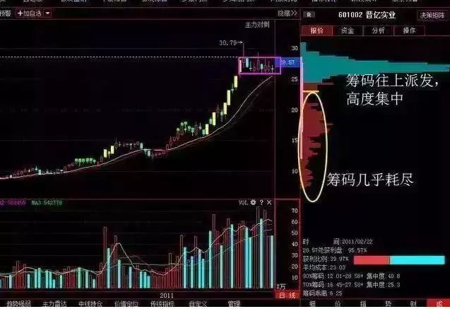 如上图中所示,为晋亿实业前期的吸筹工作,时长近两年,筹码集中收集区域在8元左右。这个区域,也就是主力吸筹的大体成本。