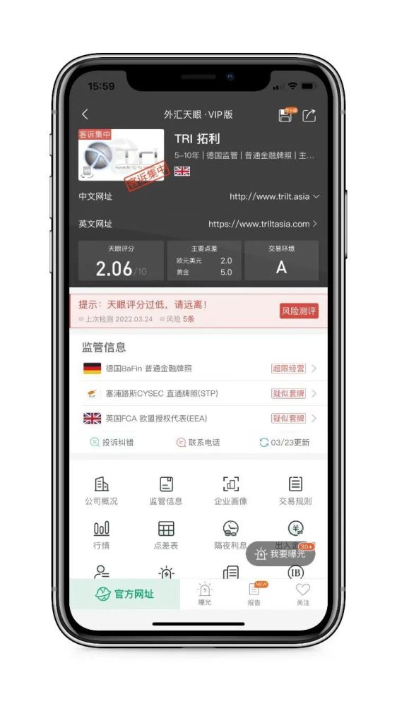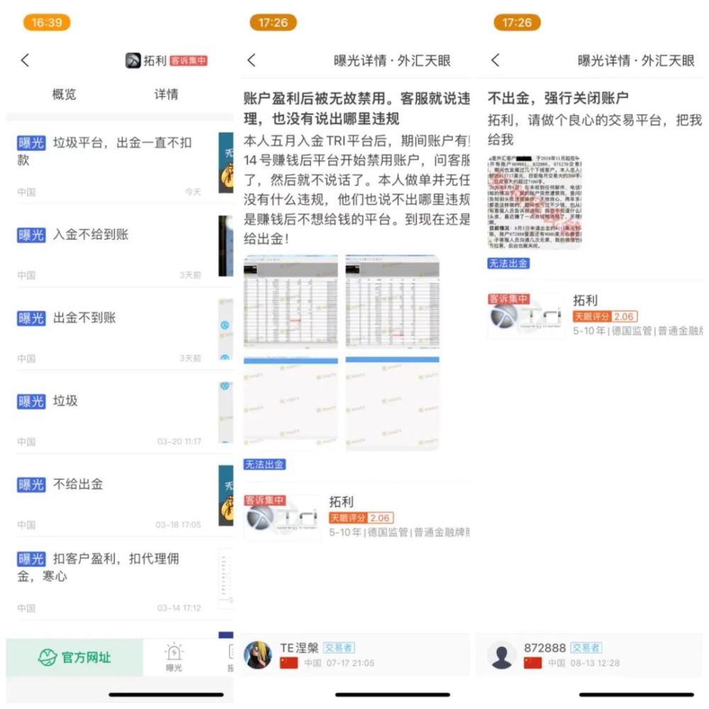在外汇天眼上查询到,TRI·拓利天眼评分2.06分,宣称持有的三张监管牌照均有问题,德国BaFin普通金融牌照超限经营,塞浦路斯CYSEC直通牌照疑似套牌,英国FCA欧盟授权代表牌照疑似套牌,在其曝光台中出现了大量的客诉,存在风险,望投资者注意警惕。