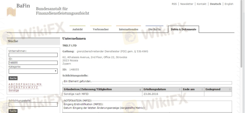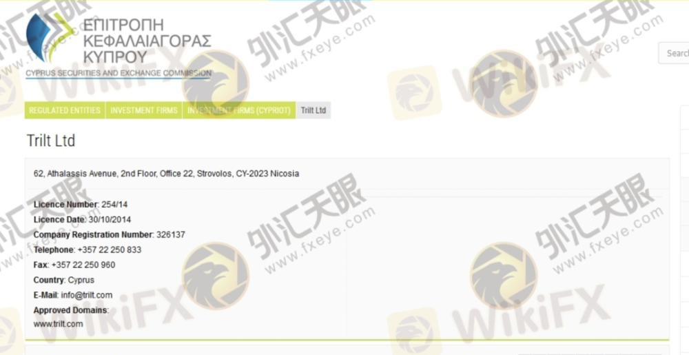 拓利宣称持有的塞浦路斯CYSEC直通牌照疑似套牌,该监管牌照持有的机构为Trilt Ltd,持有的网站为。而TRI·拓利背后的公司名为Tri Group,网站为。