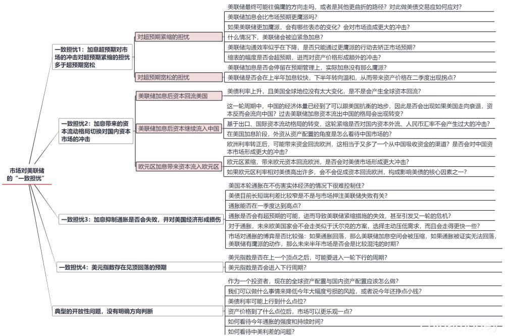 对本轮美联储紧缩,机构预期存在两大特点:(1)市场上对美联储紧缩的大部分问题存在“一致担忧”,但没有明确的“一致预期”,即普遍担忧美国通胀、美联储紧缩与资产价格的不确定性,但对具体波动的幅度与点位、甚至波动方向都未形成明确的一致预期。(2)相较货币政策本身,货币政策如何影响资产价格是机构更为关注的点。