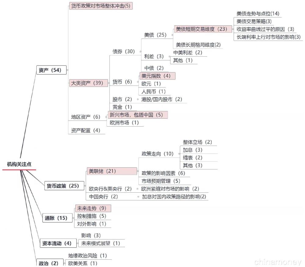 整体来看,机构最关注的就是资产,关注点占比达54%。具体而言,资产走势方面,头部机构客户对大类资产中的债券及美元关注度较高,债券中又以美债为主,按关注度降序排列依次是:美债(25)、货币政策对市场整体冲击(5)、新兴市场(5)、美元(4)与资产配置(4)。