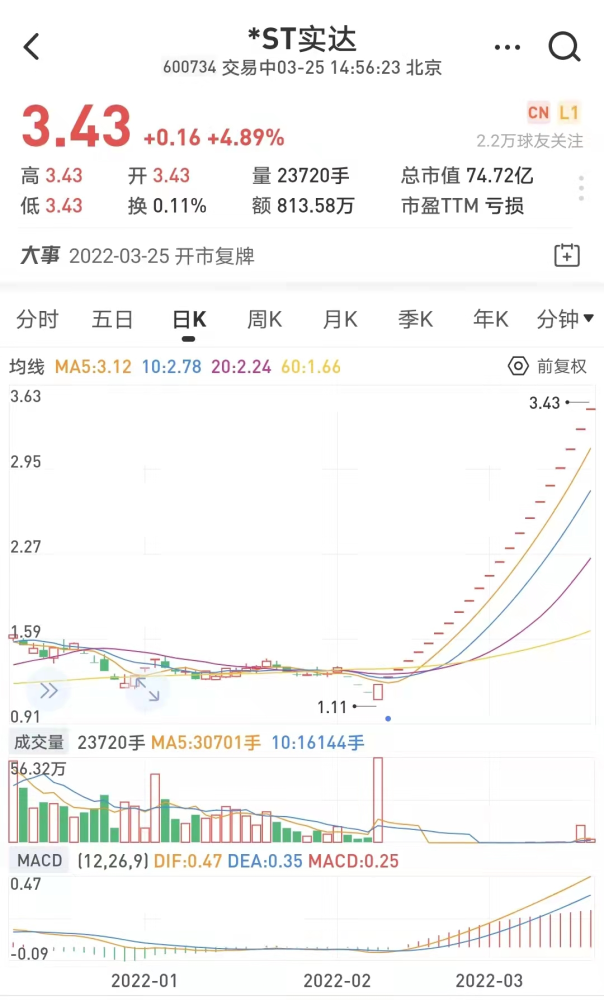 自今年2月11日开始至今天收盘,*ST实达已连续22个交易日涨停,连续涨停数量居于这段时间A股市场之冠,考虑权息因素后,期间股价涨了3倍多,这到底什么情况?