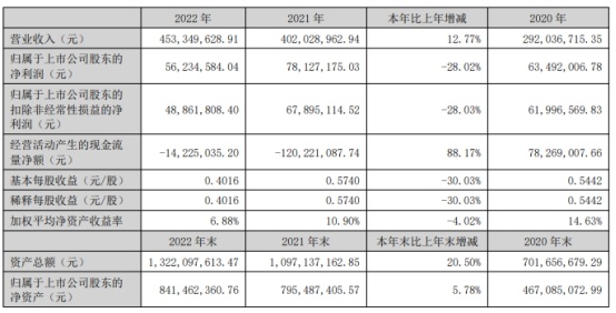冠中生态2022年营业收入为4.53亿元,同比增长12.77%;归属于上市公司股东的净利润为5623.46万元,同比下降28.02%;归属于上市公司股东的扣除非经常性损益的净利润为4886.18万元,同比下降28.03%;经营活动产生的现金流量净额为-1422.50万元,同比增加88.17%。