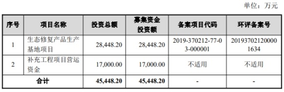 冠中生态2021年2月22日发布的招股书显示,公司拟募集资金45,448.20万元,用于生态修复产品生产基地项目、补充工程项目营运资金。