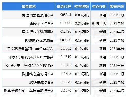 根据2021年报基金重仓股数据,重仓该股的基金共1104家,其中持有数量最多的基金为博远增强回报债券A。博远增强回报债券A目前规模为6.45亿元,最新净值0.8979(4月22日),较上一日下跌0.21%,近一年下跌7.09%。该基金现任基金经理为钟鸣远。钟鸣远在任的公募基金包括:博远双债增利混合A,管理时间为2020年4月15日至今,期间收益率为-2.02%;博远博锐混合A,管理时间为2020年7月8日至今,期间收益率为-30.06%;博远鑫享三个月债券A,管理时间为2020年9月30日至今,期间收益率为5.67%。