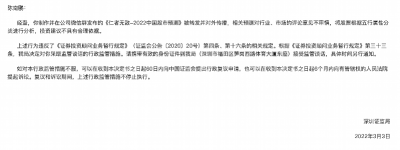 南都讯记者王玉凤3月11日,深圳证监局表示,陈南鹏制作并在公司群发布的《仁者无敌-2022中国股市预测》被转发并对外传播,相关预测对行业、市场的评论意见不审慎,将股票根据五行属性分类进行分析,投资建议不具有合理依据。