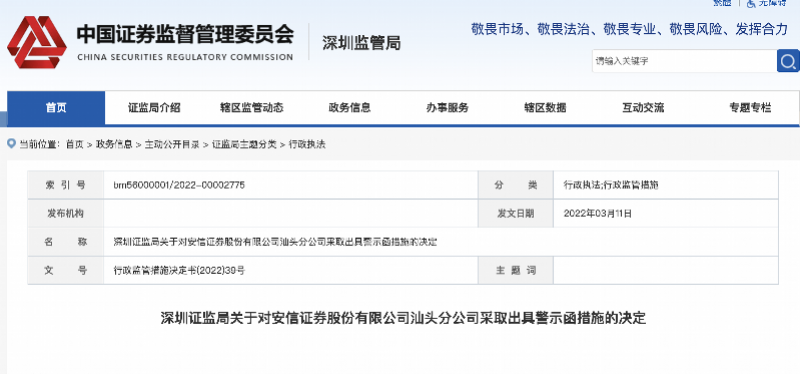 深圳证监局关于对安信证券股份有限公司汕头分公司采取出具警示函措施的决定