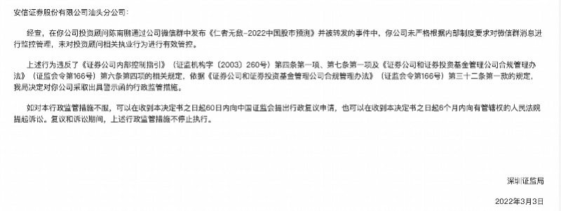 此外,安信证券股份有限公司汕头分公司因未严格根据内部制度要求对群消息进行监控管理,未对投资顾问相关执业行为进行有效管控,上述行为违反了《证券公司内部控制指引》(证监机构字〔2003〕260号)第四条第一项、第七条第一项及《证券公司和证券投资基金管理公司合规管理办法》(证监会令第166号)第六条第四项的相关规定,依据《证券公司和证券投资基金管理公司合规管理办法》(证监会令第166号)第三十二条第一款的规定,深圳证监局决定对该司采取出具警示函的行政监管措施。