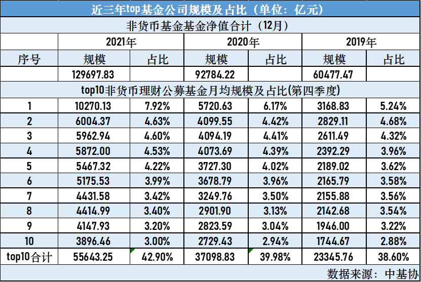 从存量上看,根据中基协数据,2021年12月非货币基金基金净值合计约为.83亿,已经比2019年多了1倍还多,其中top10基金公司占约42.90%,较2年前增长4.30%,其中尤其是处在第一位的易方达基金,一家就占据总规模的7.92%。