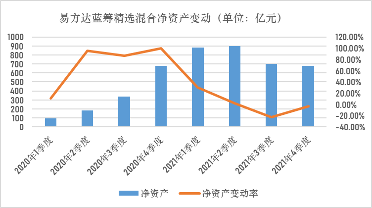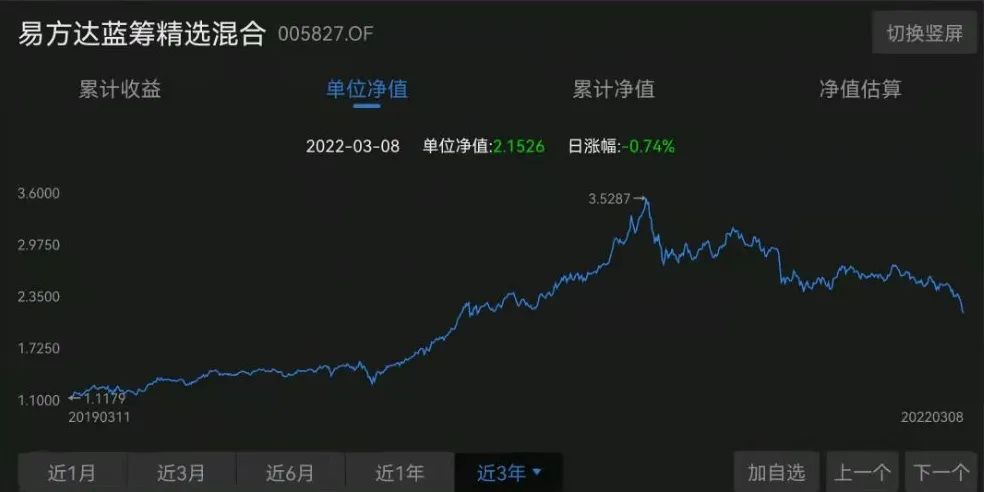 以易方达基金中人气最高的易方达蓝筹精选组合()为例,这支基金在2021年年初净值一度攀升到3.5287,但在随后的一年多中,净值不断收缩,截止2022年3月8日,净值已从高位滑落约39%,至2.1526,几近腰斩。