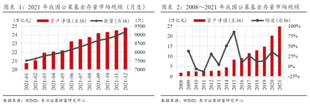 根据东方证券数据,2021年,我国公募基金市场保持高速发展,市场规模再创新高,达到24.8万亿元(数量总计9175只),增速22.5%。