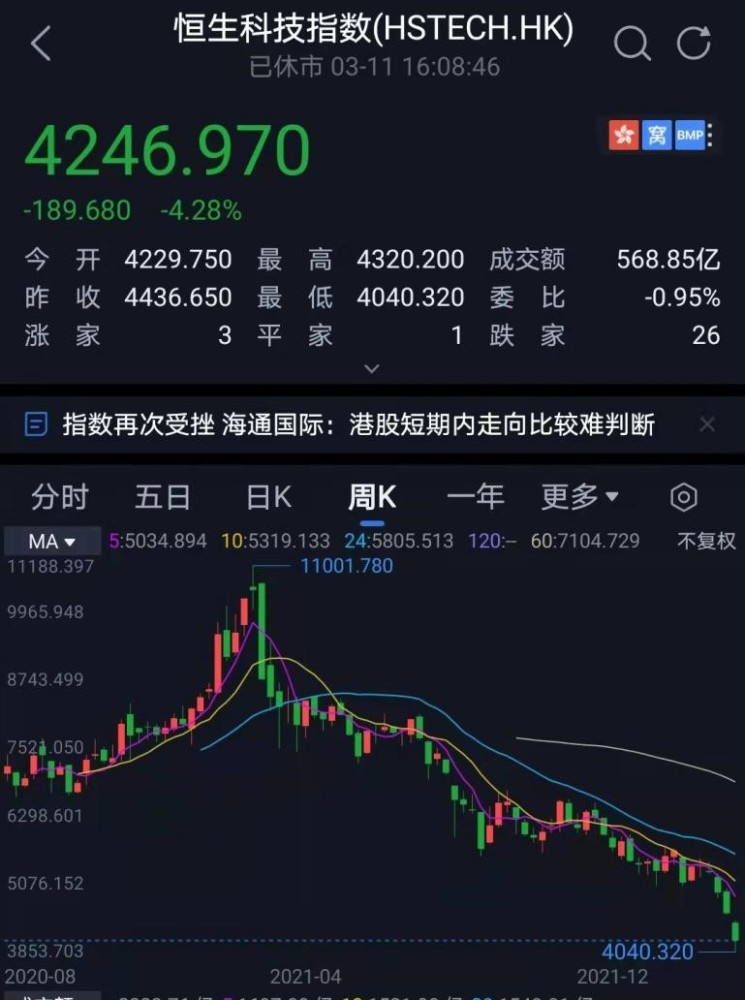 截止3月11日收盘,恒生指数当周跌6.17%,报20553.79点,恒生科技指数当周跌10.36%,报4246.97点,两大指数均创下一年来的新低。恒生科技指数更是从11000.01点高位以来,最大跌幅已经超过60%!