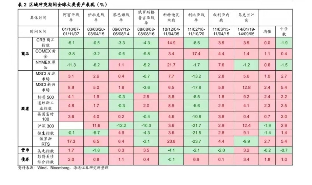 回到股市,当下最困扰投资者的无疑是俄乌局势的走势。海通证券在一份报告中整理了2000年以来几次典型区域冲突发生各类资产的表现。在发生局部冲突的初期,包括A股在内的全球权益资产普遍下跌, 但如果进一步观察区域冲突完整时期内的表现,可以发现拉长时间看,区域冲突对大类资产影响实际有限。对于不直接影响本国的国际区域冲突,A股短期可能会受情绪扰动出现下跌,但后期怎么走取决自身基本面。