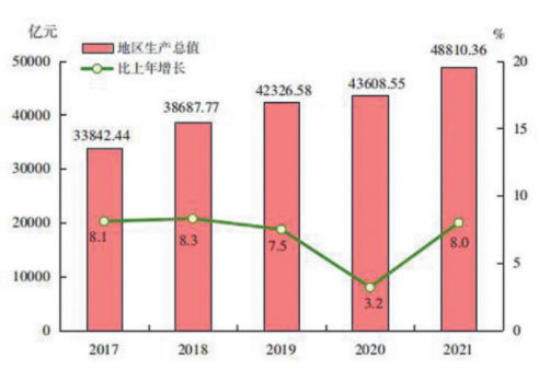 初步核算,全年实现地区生产总值48810.36亿元,比上年增长8.0%。其中,第一产业增加值2897.74亿元,增长4.9%;第二产业增加值22866.32亿元,增长7.5%;第三产业增加值23046.30亿元,增长8.8%。第一产业增加值占地区生产总值的比重为5.9%,第二产业增加值比重为46.8%,第三产业增加值比重为47.3%。全年人均地区生产总值元,比上年增长7.3%。