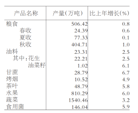 全年农林牧渔业总产值5200.97亿元,比上年增长5.1%。粮食种植面积83.51万公顷,比上年增加0.07万公顷。粮食产量506.42万吨,比上年增加4.10万吨,增长0.8%。其中,稻谷产量393.18万吨,增加1.43万吨,增长0.4%。