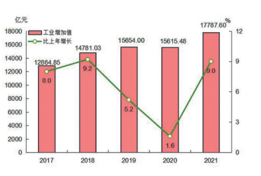 全年全部工业增加值17787.60亿元,比上年增长9.0%。规模以上工业增加值增长9.9%。其中,轻工业增长10.8%,重工业增长9.0%;采矿业下降8.8%,制造业增长10.0%,电力、热力、燃气及水生产和供应业增长13.4%。工业产品销售率96.47%。