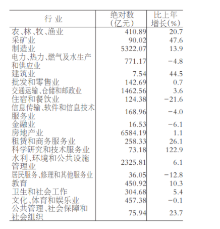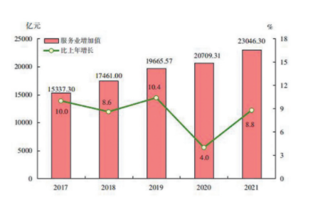 全年批发和零售业增加值5552.53亿元,比上年增长15.4%;交通运输、仓储和邮政业增加值1772.74亿元,增长13.1%;住宿和餐饮业增加值696.23亿元,增长14.2%;金融业增加值3623.07亿元,增长5.2%;房地产业增加值2813.92亿元,增长4.8%。规模以上服务业企业营业收入比上年增长22.3%。