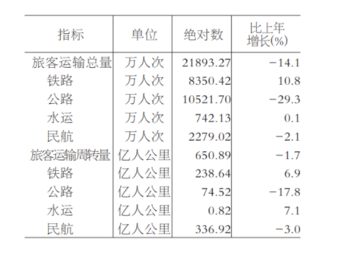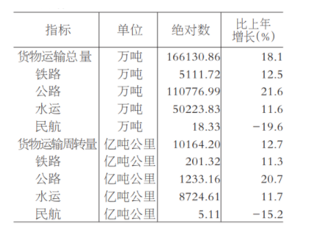 全年货物运输总量.86万吨,比上年增长18.1%,货物运输周转量10164.20亿吨公里,增长12.7%。旅客运输总量21893.27万人次,下降14.1%,旅客运输周转量650.89亿人公里,下降1.7%。