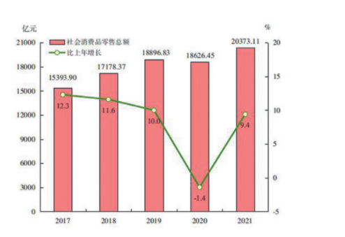 图8 2017—2021年社会消费品零售总额及其增长速度