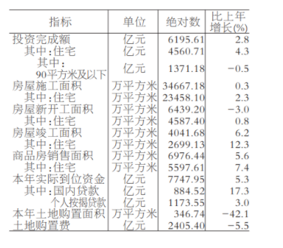 全年房地产开发企业投资6195.61亿元,比上年增长2.8%。其中,住宅投资4560.71亿元,增长4.3%。