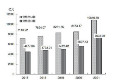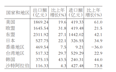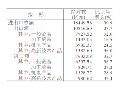 全年进出口总额18449.58亿元,比上年增长30.9%。其中,出口额10816.50亿元,增长27.7%;进口额7633.08亿元,增长35.7%。进出口顺差3183.42亿元。