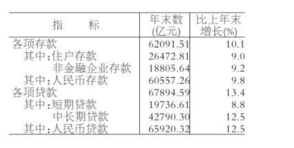 年末金融机构本外币各项存款余额62091.51亿元,比上年末增长10.1%;金融机构本外币各项贷款余额67894.59亿元,比上年末增长13.4%。