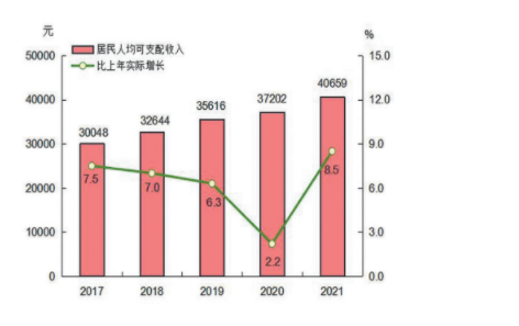 图11 2017—2021年居民人均可支配收入及其实际增长速度