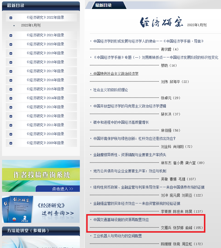 近日,我校经济学院院长、中国共同富裕研究院执行院长文雁兵教授与宁波大学商学院张梦婷博士、北京科技大学经济管理学院俞峰博士的合作论文《中国交通基础设施的资源再配置效应》在《经济研究》2022年第1期刊发。