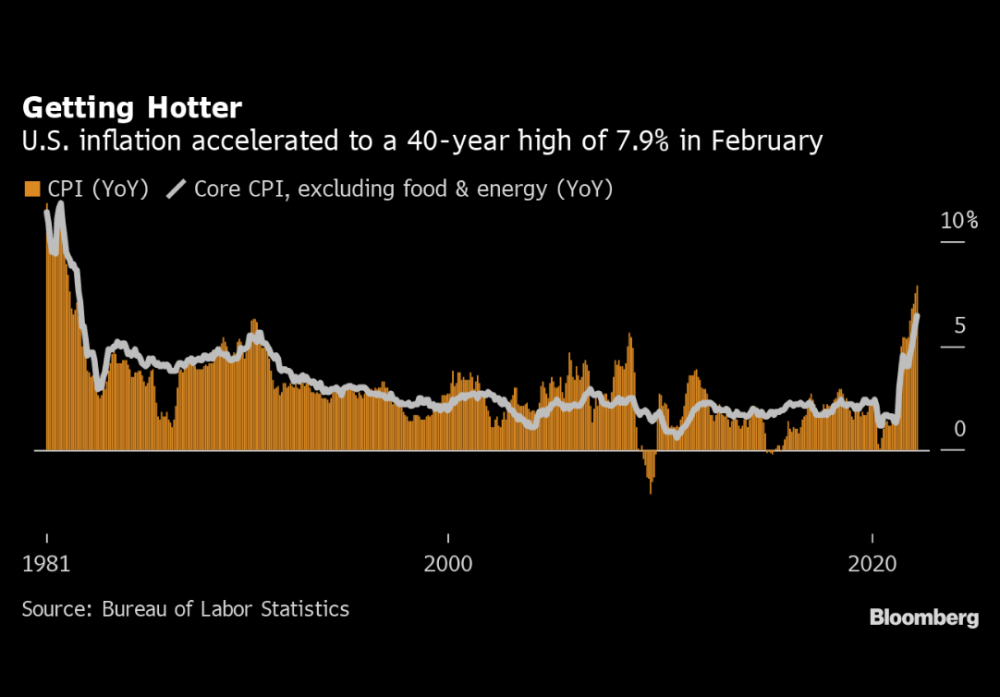 美国2月CPI同比急升7.9%创40年来最大涨幅,料未来两个月将超过8%】