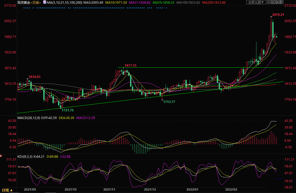 整体来看,地缘局势的担忧和美联储加息预期共同左右金价走势,市场情绪多变,短线金价仍偏向宽幅震荡运行,从技术面来看,金价短线略微偏向震荡下行,关注1960附近支撑,上方关注2010和2020两道整数关口阻力。